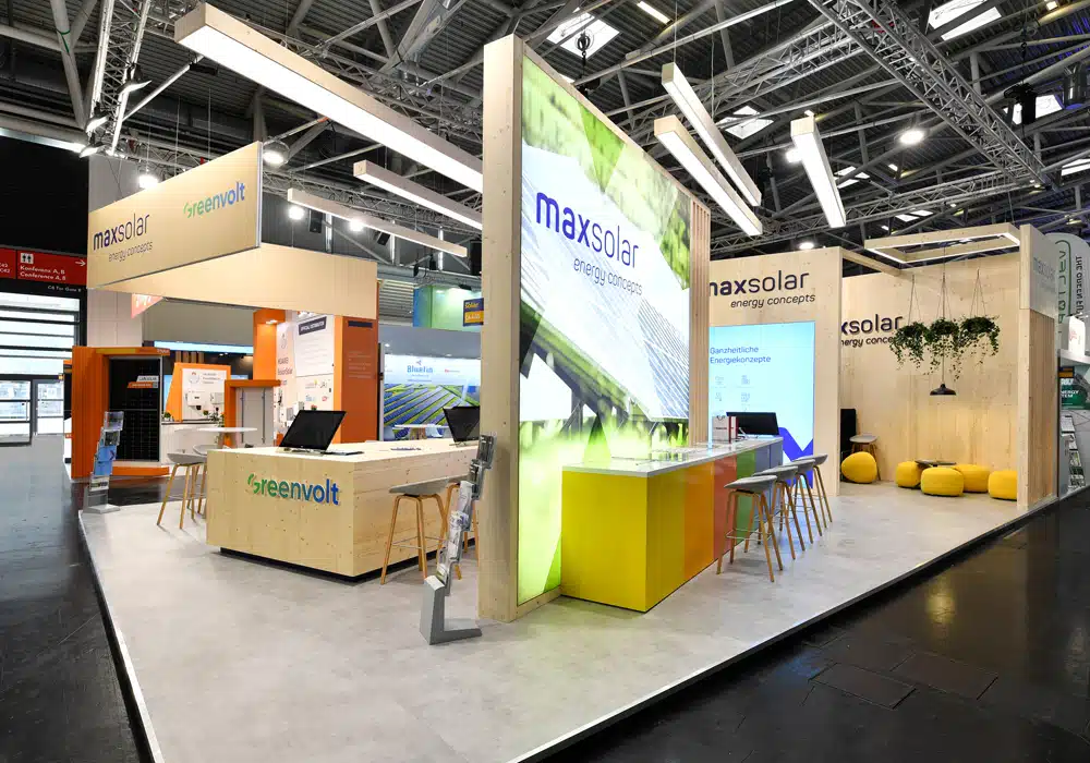 The Traunstein-based company MaxSolar plans the entire process chain of solar and wind power systems for their customers. The guiding principle "Green Power for All" was to be reflected in MaxSolar's first trade show appearance at Intersolar 2023. The focal point of the booth was a large communication island with inviting presentation and meeting spaces. A dynamic orientation and the individually manufactured ceiling lights running in parallel symbolized the motivation and energy of the employees, their desire to change and make an impact on the market. Untreated and reusable wood gave the booth a naturally pure, sustainable value. Long, vertical wooden slats represented the growth and upswing of the industry. A large LED wall and a colorfully accentuated display for the 3D models added visual highlights. With great success: The booth was always well-attended and attracted many interested visitors due to its innovative design.